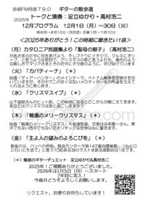 12月プログラム 12月1日(月)~ 30日(火) トークと演奏:足立ゆかり・高村浩二 今月は2025年ありがとう!この季節に聞きたい1曲をお送りしています。今月は何かと気ぜわしい時こそ、ほっとする楽曲で楽しんで頂きた […]